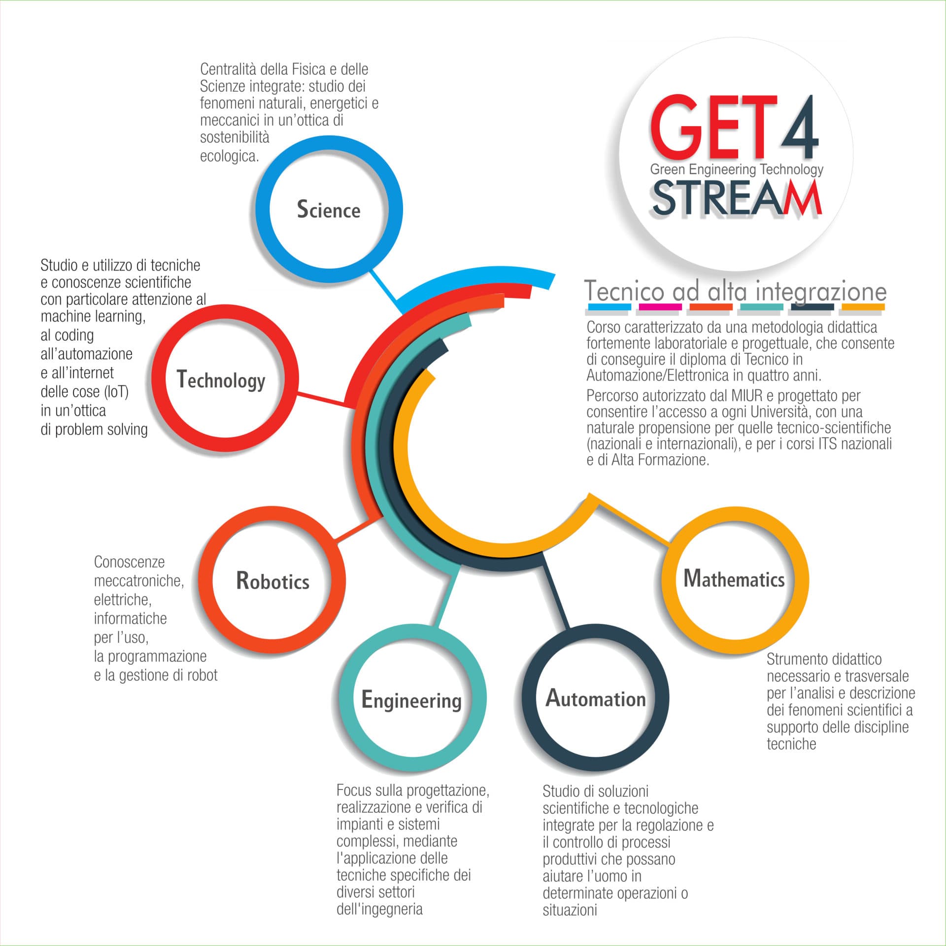 GET4 STREAM (Green Engineering TechnologyScience Technology, Robotic, Engineering, Automation, Mathematics) è il nome del nuovo quadriennio innestato sull’indirizzo di elettronica ed elettrotecnica – Automazione. L’obiettivo quello di creare la figura di un tecnico “Alta integrazione “ esperto nei settori tipici dell’industry 4.0: uno STREAM Engineer in grado di connettere e correlare le competenze tipiche delle discipline STEM per poter agire con efficacia nel campo della system integration, della robotica e dell’automazione industriale.